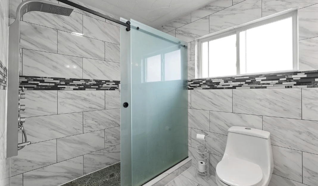 • Modern bathroom with marble tiles, a walk-in shower with frosted glass door, and a high window with daylight.